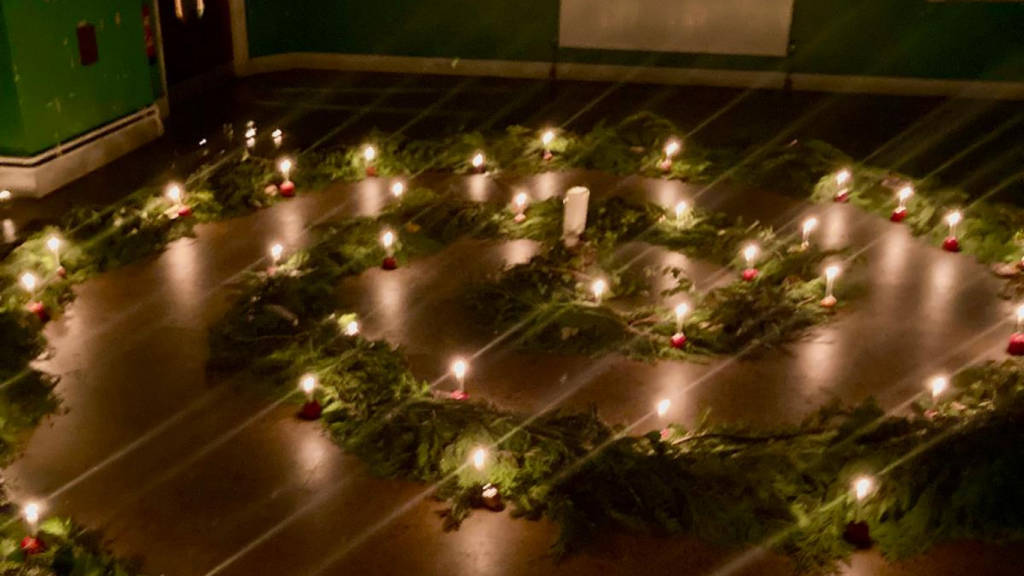 The Advent spiral reflects the soul’s journey during this season, as we move through the darkness of shorter days and longer nights, carrying the light of hope within us toward the return of the sun’s brilliance after the winter solstice.